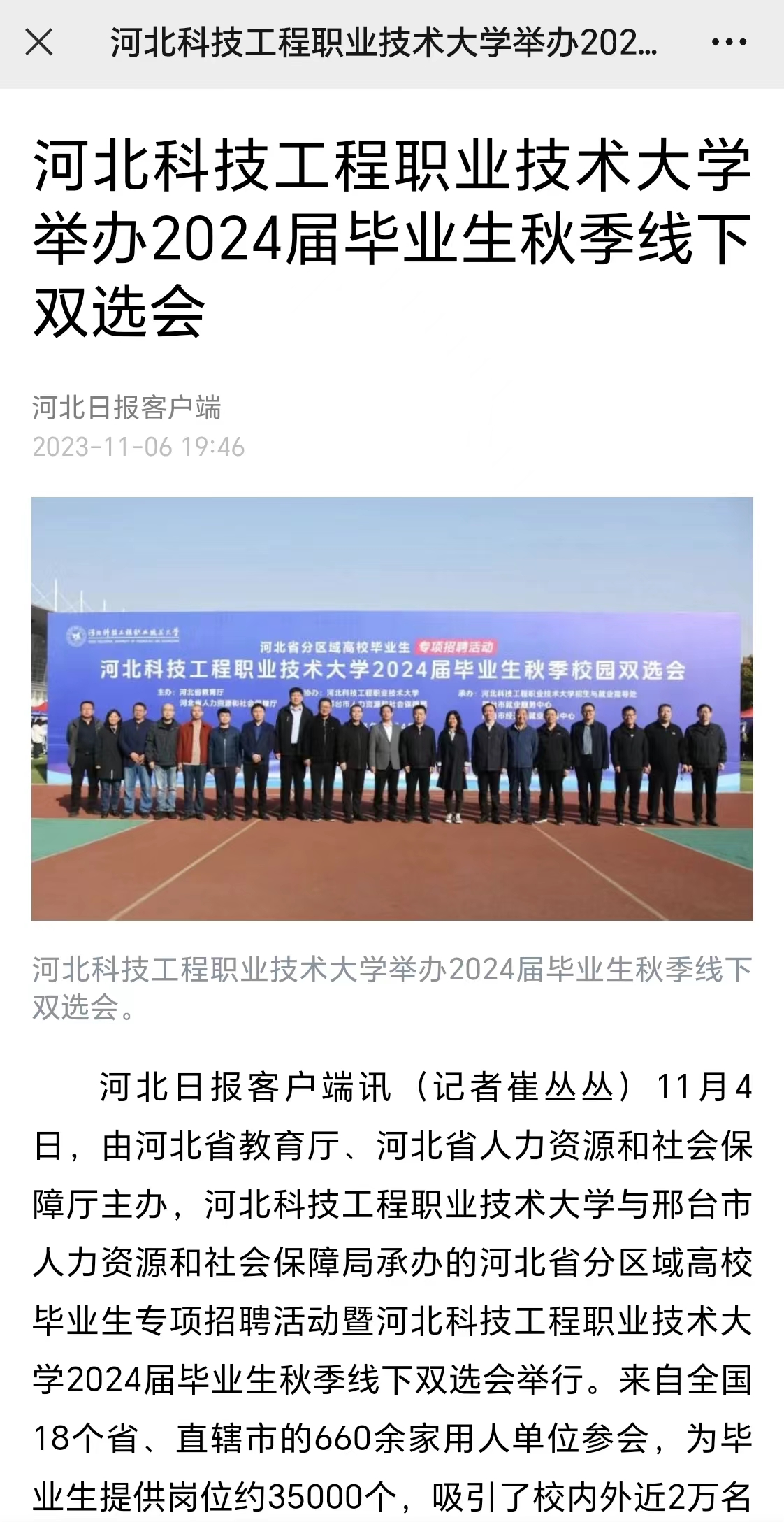 河北日报客户端讯(记者崔丛丛)11月4日,由河北省教育厅、河北省人力资源和社会保障厅主办,beat365英国官方网站与邢台市人力资源和社会保障局承办的河北省分区域高校毕业生专项招聘活动暨beat365英国官方网站2024届毕业生秋季线下双选会举行。来自全国18个省、直辖市的660余家用人单位参会,为毕业生提供岗位约35000个,吸引了校内外近2万名学生入场求职。