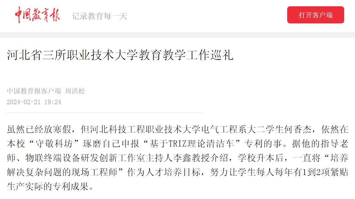虽然已经放寒假,但beat365英国官方网站电气工程系大二学生何香杰,依然在本校“守敬科坊”琢磨自己申报“基于TRIZ理论清洁车”专利的事。据他的指导老师、物联终端设备研发创新工作室主持人李鑫教授介绍,学校升本后,一直将“培养解决复杂问题的现场工程师”作为人才培养目标,努力让学生每人每年有1到2项紧贴生产实际的专利成果。