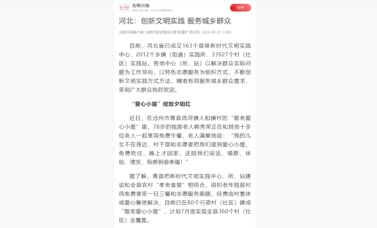 这仅仅是河北省新时代文明实践中心、所、站建设的一个缩影。在各地新时代文明实践中心推动下,结合各级民政部门的养老服务中心等机构发展,一大批“爱心小屋”“孝老食堂”“幸福小院”如雨后春笋不断涌现,目前河北全省已有40多个县(市、区)启动了“爱心小屋”建设。