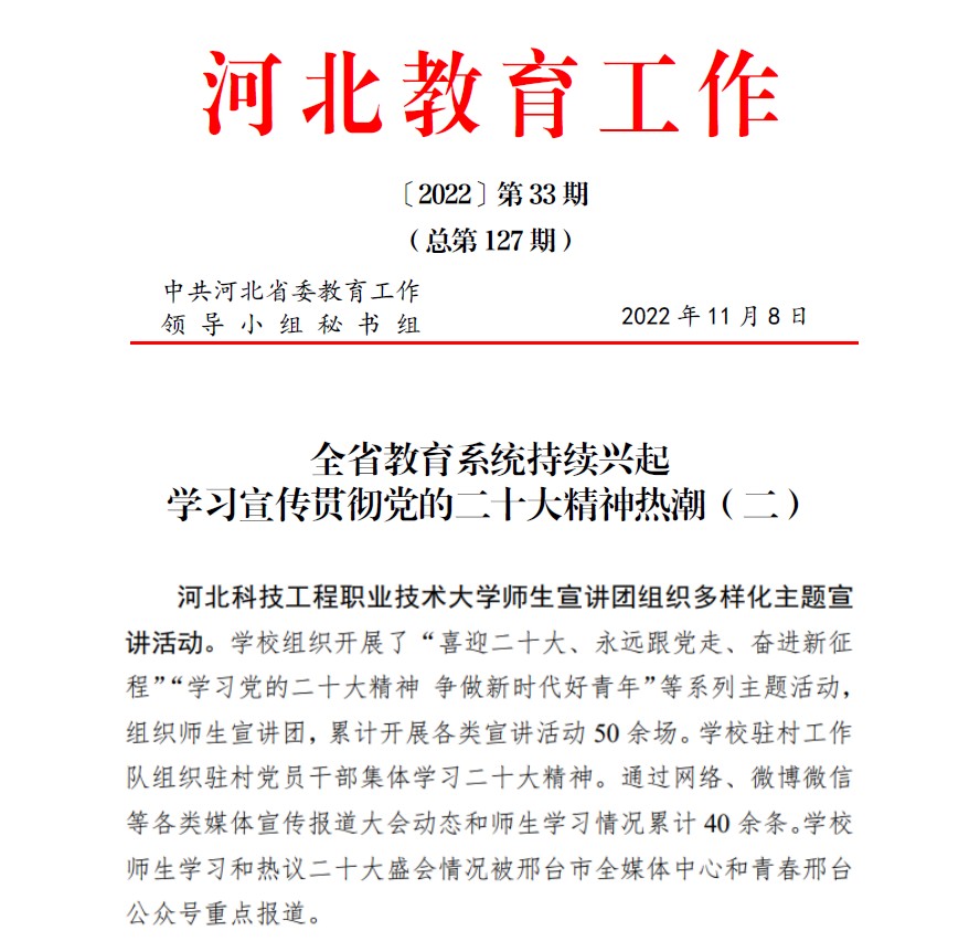 beat365英国官方网站师生宣讲团组织多样化主题宣讲活动。学校组织开展了“喜迎二十大、永远跟党走、奋进新征程”“学习党的二十大精神争做新时代好青年”等系列主题活动,组织师生宣讲团,累计开展各类宣讲活动50余场。学校驻村工作队组织驻村党员干部集体学习二十大精神。通过网络、微博微信等各类媒体宣传报道大会动态和师生学习情况累计40余条。学校师生学习和热议二十大盛会情况被邢台市全媒体中心和青春邢台公众号重点报道。