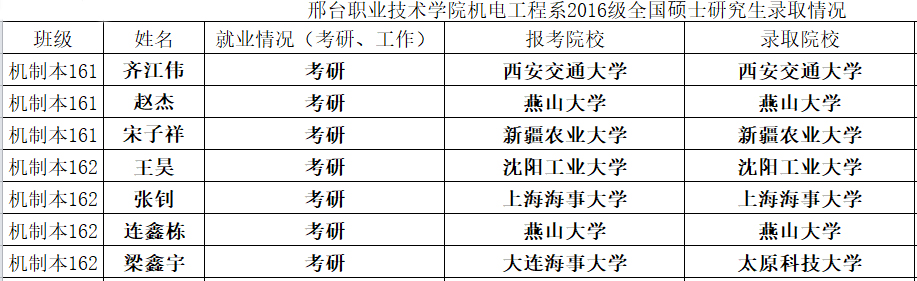 本网讯(通讯员 张沛沛)2020年硕士研究生录取工作落下帷幕,在邢台职业技术学院及机电工程系全体师生的共同努力下,机电工程系本科毕业生硕士研究生过线率与录取率均取得重大突破。机电工程系2020届本科毕业生共50人,其中24人参加硕士研究生考试,13人通过国家分数线,过线率超过50%,7人被成功录取,其中机制161本的齐江伟同学以400分的高分考入西安交通大学。