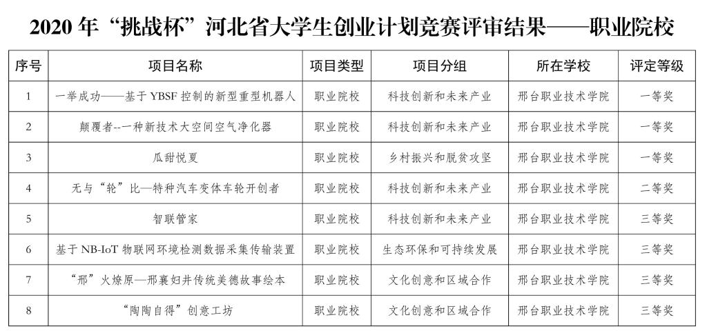 本网讯(通讯员 张沛沛)近日,2020年第十二届“挑战杯”河北省大学生创业计划竞赛落下帷幕。本届大赛自今年7月份启动以来,经过层层选拔,激烈角逐,邢台职业技术学院报送的10项作品从全省88所学校的1423件参赛作品中脱颖而出,8项作品获奖,其中一等奖3项,二等奖1项,三等奖4项。