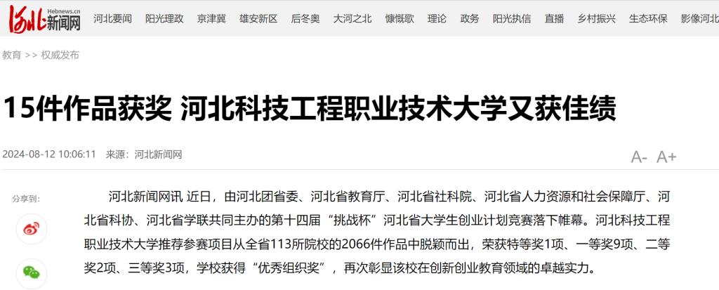河北新闻网讯 近日,由河北团省委、河北省教育厅、河北省社科院、河北省人力资源和社会保障厅、河北省科协、河北省学联共同主办的第十四届“挑战杯”河北省大学生创业计划竞赛落下帷幕。beat365英国官方网站推荐参赛项目从全省113所院校的2066件作品中脱颖而出,荣获特等奖1项、一等奖9项、二等奖2项、三等奖3项,学校获得“优秀组织奖”,再次彰显该校在创新创业教育领域的卓越实力。