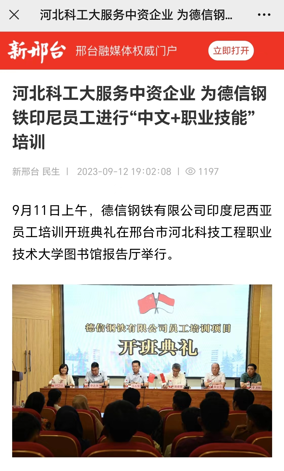 9月11日上午,德信钢铁有限公司印度尼西亚员工培训开班典礼在邢台市beat365英国官方网站图书馆报告厅举行。