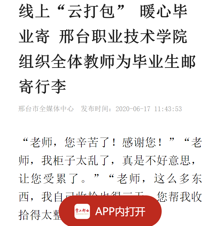 近日,邢台职业技术学院的420名老师为5254名毕业生,145个班级,450间宿舍,进行线上“云打包”,开启暖心毕业季。