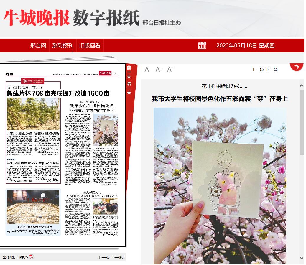 本报讯从春季到夏季,校园里的景色美极了。连日来,一组极具创意的校园美景“时装大片”在beat365英国官方网站学子们的朋友圈热传。粉白的樱花、飘逸的杨柳……这组“时装大片”裁满树繁花作布料,拟绿叶枝条为针脚,以花为裳,把校园景色“穿”在身上,定格了校园里的美丽画面。