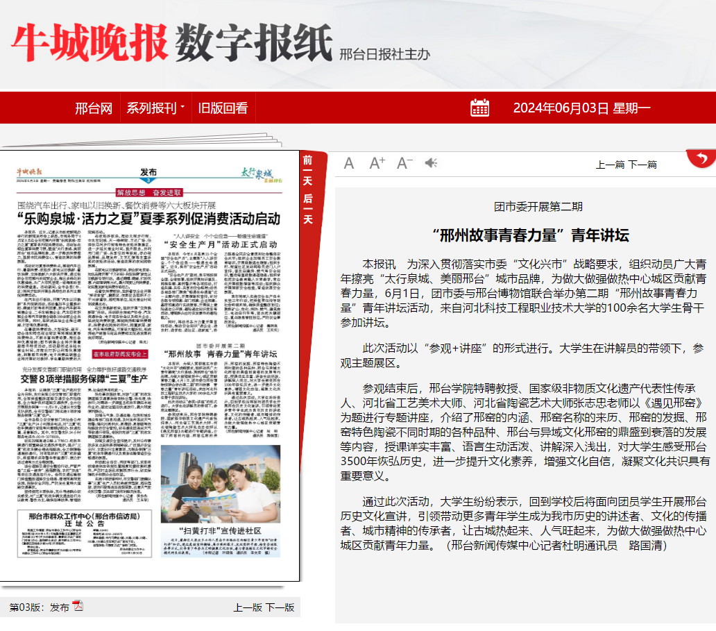 本报讯 为深入贯彻落实市委“文化兴市”战略要求,组织动员广大青年擦亮“太行泉城、美丽邢台”城市品牌,为做大做强做热中心城区贡献青春力量,6月1日,团市委与邢台博物馆联合举办第二期“邢州故事青春力量”青年讲坛活动,来自beat365英国官方网站的100余名大学生骨干参加讲坛。