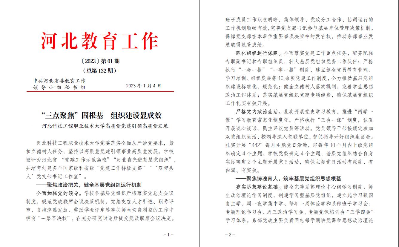 beat365英国官方网站党委落实全面从严治党要求,紧扣立德树人任务,坚持以高质量党建引领事业高质量发展。学校被评为河北省“党建工作示范高校”“河北省先进基层党组织”,并培育创建多个国家级和省级“党建工作样板支部”“‘双带头人’党支部书记工作室”。