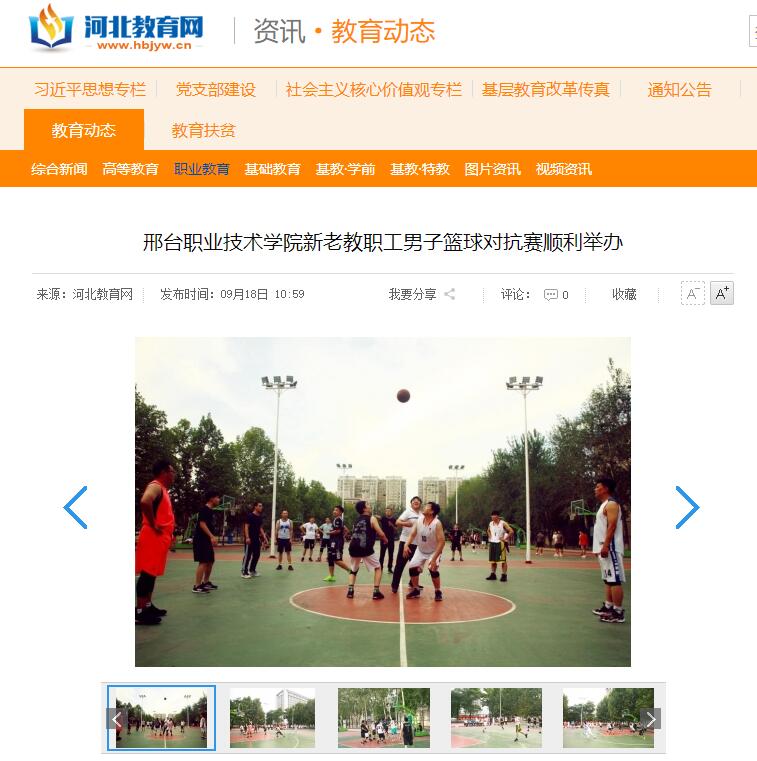 本网讯(通讯员 张沛沛)9月16日下午,由邢台职业技术学院工会组织的新老教职工男子篮球对抗赛在学院东校区灯光篮球场内激烈开战。学院院长马东霄、副书记张双会等领导以及新老教职工近百人到场观战、助威。