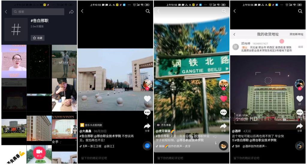 告白邢职——云上抖起来。在抖音平台邀请毕业生们告白邢职,记录毕业期间反映学习、生活中的关于母校的拼搏奋进、温馨感人的故事,留下与邢职最美好的回忆。该话题总播放量达2万余次,引发同学们的强烈共鸣。