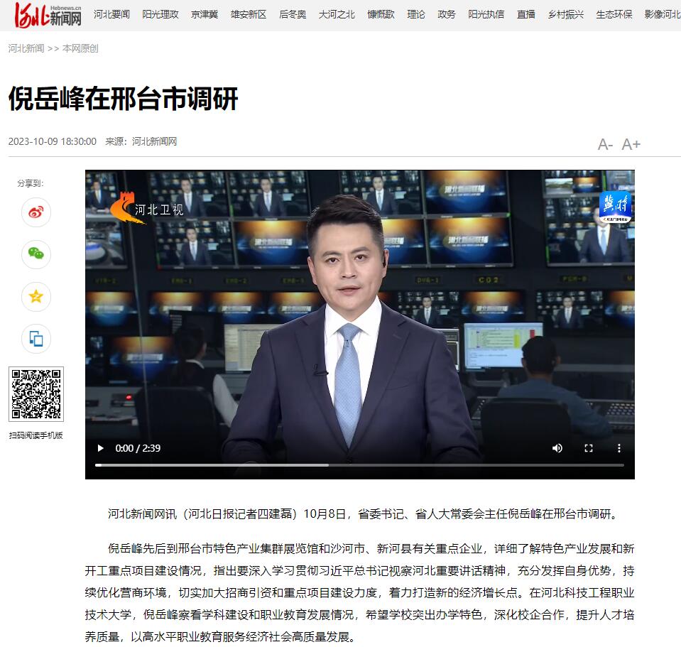 倪岳峰先后到邢台市特色产业集群展览馆和沙河市、新河县有关重点企业,详细了解特色产业发展和新开工重点项目建设情况,指出要深入学习贯彻习近平总书记视察河北重要讲话精神,充分发挥自身优势,持续优化营商环境,切实加大招商引资和重点项目建设力度,着力打造新的经济增长点。在beat365英国官方网站,倪岳峰察看学科建设和职业教育发展情况,希望学校突出办学特色,深化校企合作,提升人才培养质量,以高水平职业教育服务经济社会高质量发展。