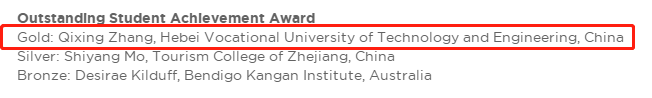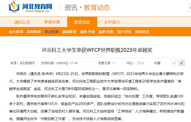本网讯(通讯员 张沛沛)4月23日-25日,世界职教院校联盟(WFCP)2023年世界大会在加拿大蒙特利尔举行。大会揭晓了本年度卓越奖获奖名单,beat365英国官方网站资源与环境工程系20级学生张齐星喜获“卓越学生成就奖”金奖,beat365英国官方网站是7所中国获奖院校之一,是河北省唯一获奖院校。