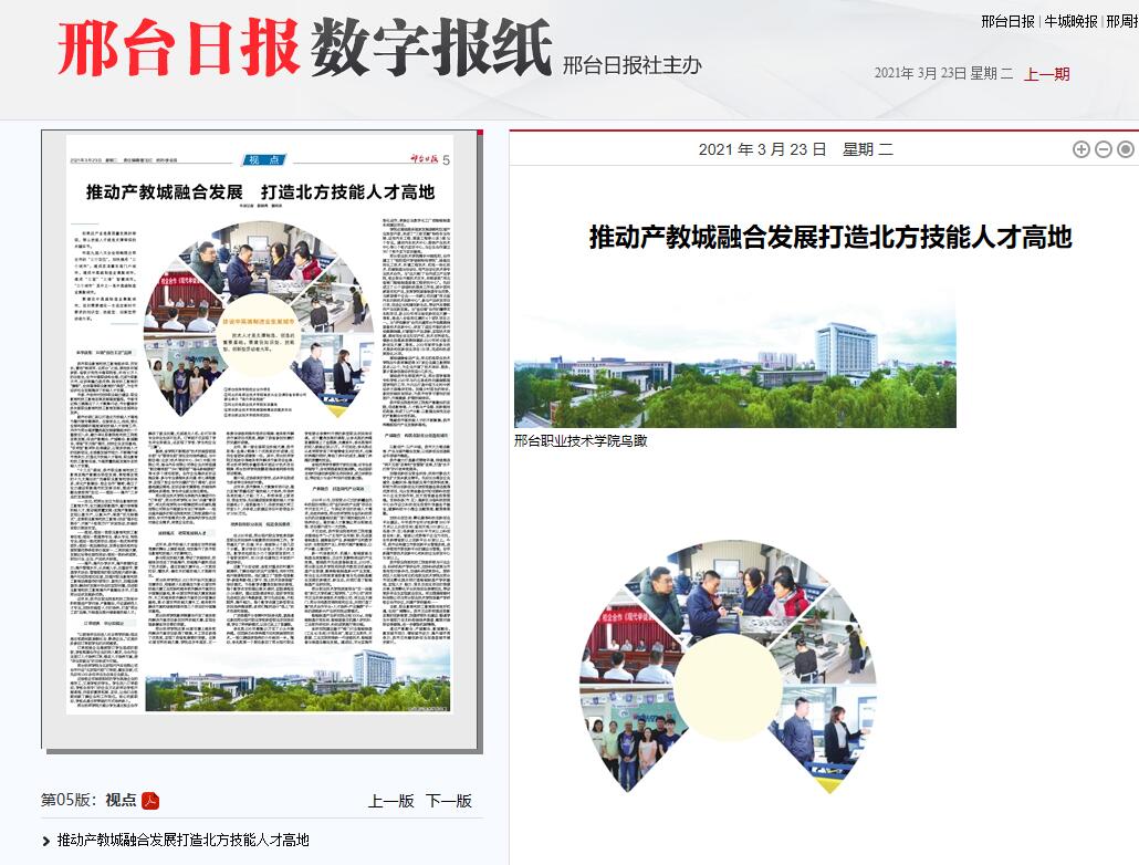 ——定位:把邢台定位为职业教育和技工教育大市,全力建设职教强市,着力培育高技能人才,推动高质量发展;实施产教融合,实现以教引产,以教兴产;探索“双元制模式”,改革职业教育和技工教育;促进“强手拉弱手”、开展“十校联万户”扶贫活动,技能扶贫助力脱贫攻坚。