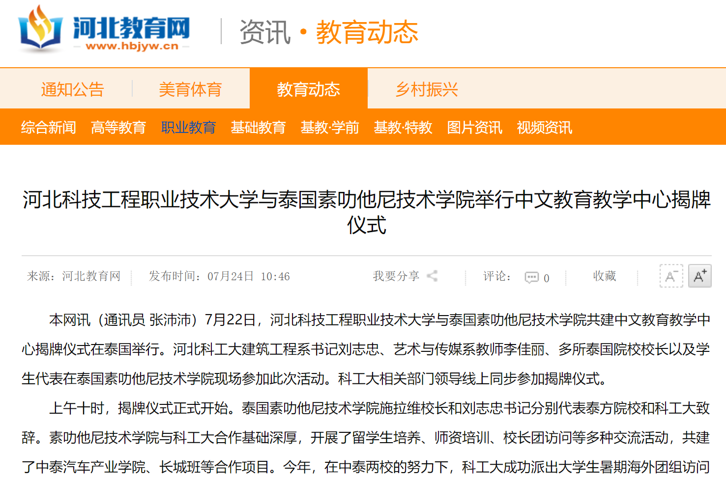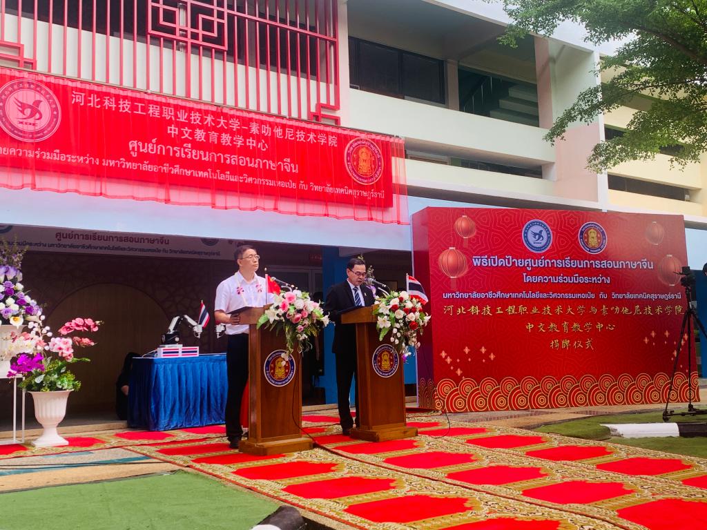 本网讯(通讯员 张沛沛)7月22日,beat365英国官方网站与泰国素叻他尼技术学院共建中文教育教学中心揭牌仪式在泰国举行。beat365英国官方网站建筑工程系书记刘志忠、艺术与传媒系教师李佳丽、多所泰国院校校长以及学生代表在泰国素叻他尼技术学院现场参加此次活动。beat365相关部门领导线上同步参加揭牌仪式。
