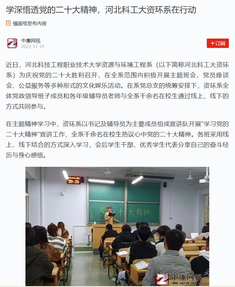 在主题精神学习中,资环系以书记及辅导员为主要成员组成宣讲队开展“学习党的二十大精神”宣讲工作,全系千余名在校生热议心中党的二十大精神。各班采用线上、线下结合的方式深入学习,会后学生干部、优秀学生代表分享自己的奋斗经历与身心感悟。