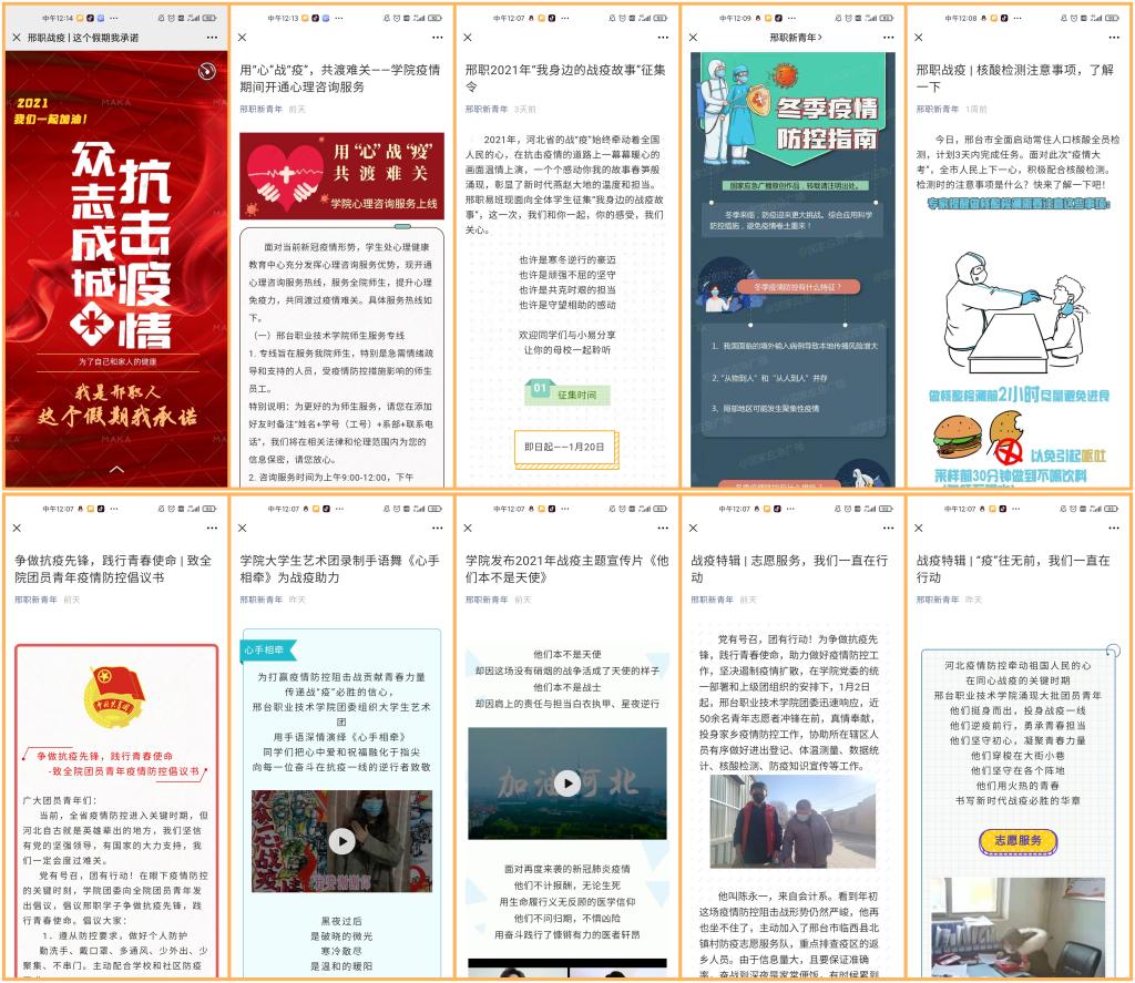 1月3日起,学院学生工作处(团委)使用微博、抖音、微信、易班等新媒体平台,制作发布《致全院团员青年疫情防控倡议书》《同舟共冀|疫情下的感动与力量》《邢职战疫|核酸检测注意事项,了解一下》《正视疫情防控形势,切实做到不麻痹不松懈》等推文14篇,积极引导社会舆论,宣传普及防护知识。积极响应共青团河北省委、共青团邢台市委倡议,发布《邢台籍返乡大学生团员招募令》,动员50余名青年志愿者投身家乡疫情防控工作,协助所在辖区人员有序做好进出登记、体温测量、数据统计、核酸检测、防疫知识宣传等工作。