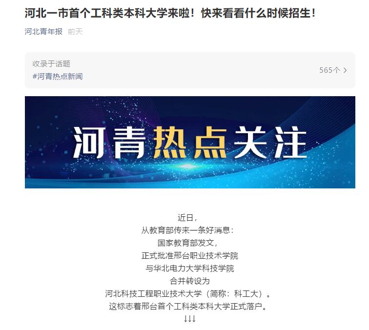 这标志着邢台首个工科类本科大学正式落户。