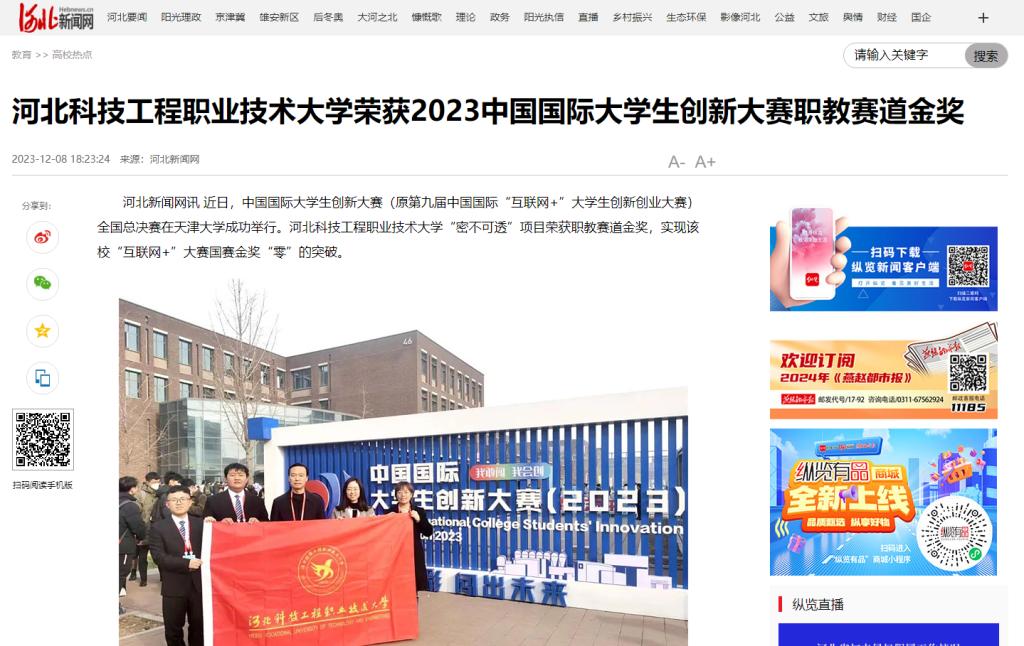 河北新闻网讯 近日,中国国际大学生创新大赛(原第九届中国国际“互联网+”大学生创新创业大赛)全国总决赛在天津大学成功举行。beat365英国官方网站“密不可透”项目荣获职教赛道金奖,实现该校“互联网+”大赛国赛金奖“零”的突破。