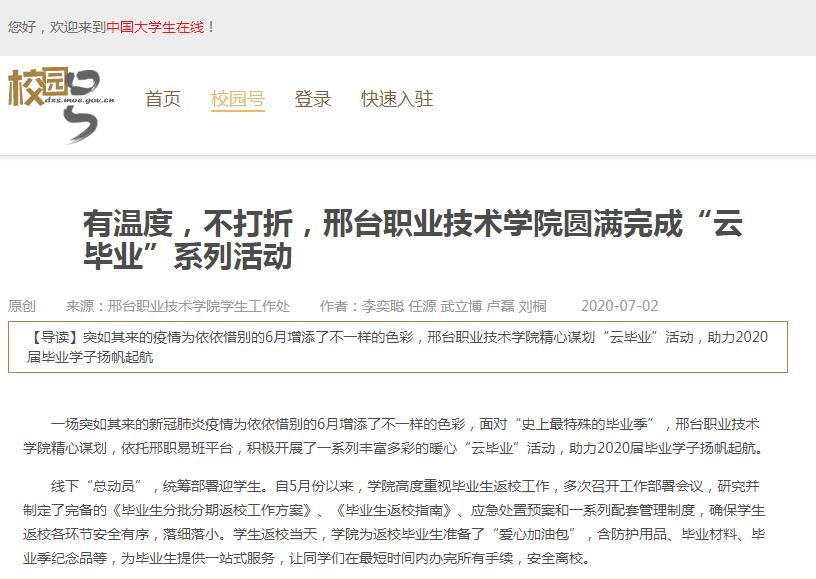 一场突如其来的新冠肺炎疫情为依依惜别的6月增添了不一样的色彩,面对“史上最特殊的毕业季”,邢台职业技术学院精心谋划,依托邢职易班平台,积极开展了一系列丰富多彩的暖心“云毕业”活动,助力2020届毕业学子扬帆起航。