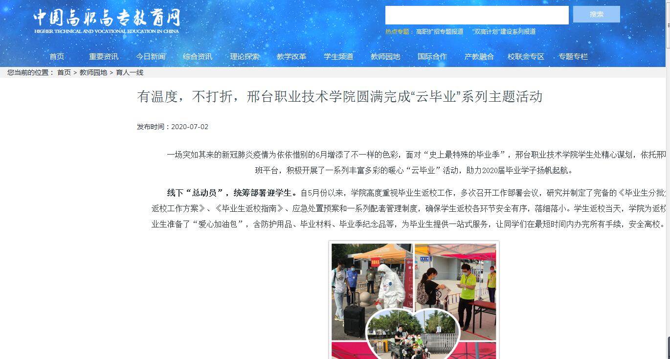 一场突如其来的新冠肺炎疫情为依依惜别的6月增添了不一样的色彩,面对“史上最特殊的毕业季”,邢台职业技术学院学生处精心谋划,依托邢职易班平台,积极开展了一系列丰富多彩的暖心“云毕业”活动,助力2020届毕业学子扬帆起航。