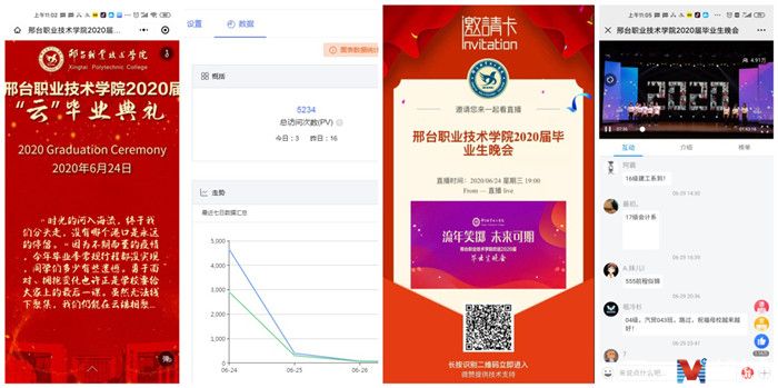线上“云毕业”,此去后会有期。受疫情影响,6月24日学院依托微信H5发布“云”毕业典礼,晚7点采取“直播+现场”双结合的形式举办“流年笑掷 未来可期”毕业主题晚会,以别样方式为邢职学子美好的大学生涯画下圆满句号。虽然没有往日热闹的场景,但严谨的会议流程、精心的舞台布置、暖心的视频祝福一样都不落。截至目前,毕业典礼访问量近6000人,超4.8万人观看了毕业晚会的直播,点赞量达1.16万人次,同学们纷纷留言,用跃动的弹幕诉说着对母校的感激与眷恋。
