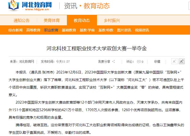 本报讯 (通讯员 张沛沛)2023年12月6日,2023中国国际大学生创新大赛(原第九届中国国际“互联网+”大学生创新创业大赛)落下了帷幕,beat365英国官方网站(以下简称“beat365英国官方网站”)密不可透团队在上千个项目中突出重围,斩获大赛职教赛道金奖。实现了该校“互联网+”大赛国赛金奖“零”的突破,具有里程碑式意义。