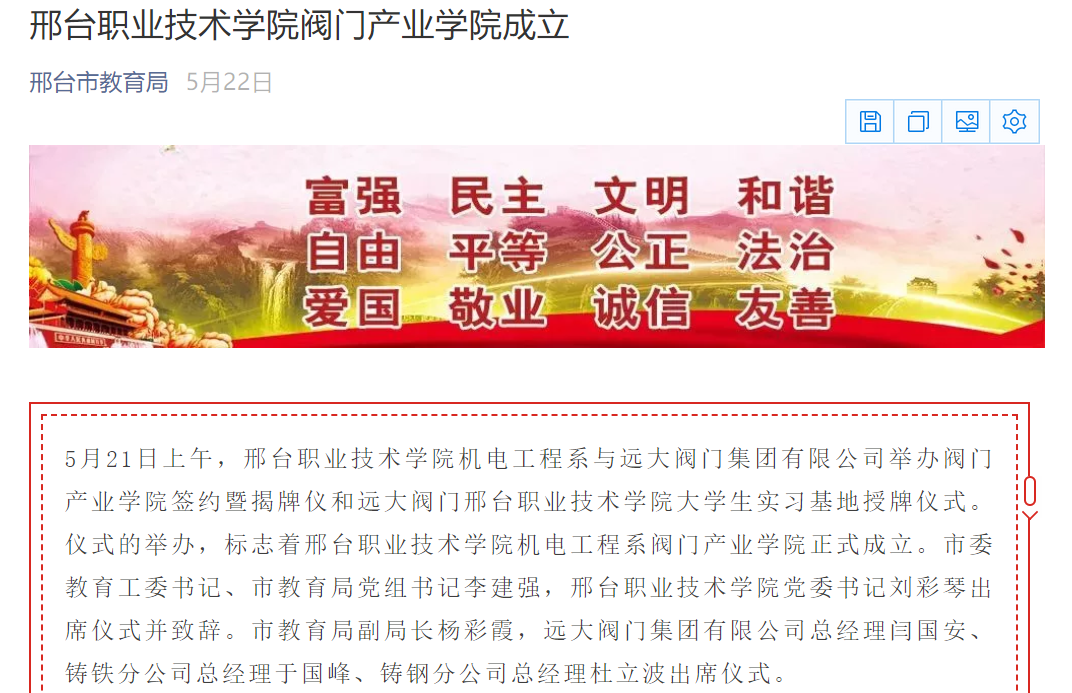 5月21日上午,邢台职业技术学院机电工程系与远大阀门集团有限公司举办阀门产业学院签约暨揭牌仪和远大阀门邢台职业技术学院大学生实习基地授牌仪式。仪式的举办,标志着邢台职业技术学院机电工程系阀门产业学院正式成立。市委教育工委书记、市教育局党组书记李建强,邢台职业技术学院党委书记刘彩琴出席仪式并致辞。市教育局副局长杨彩霞,远大阀门集团有限公司总经理闫国安、铸铁分公司总经理于国峰、铸钢分公司总经理杜立波出席仪式。