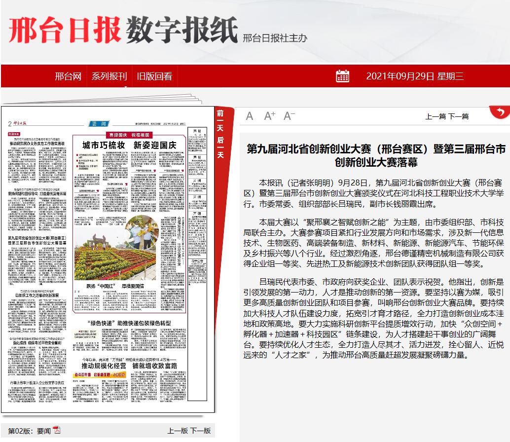 本届大赛以“聚邢襄之智赋创新之能”为主题,由市委组织部、市科技局联合主办。大赛参赛项目紧扣行业发展方向和市场需求,涉及新一代信息技术、生物医药、高端装备制造、新材料、新能源、新能源汽车、节能环保及乡村振兴等八个行业。经过激烈角逐,邢台德谨精密机械制造有限公司获得企业组一等奖、先进热工及新能源技术创新团队获得团队组一等奖。