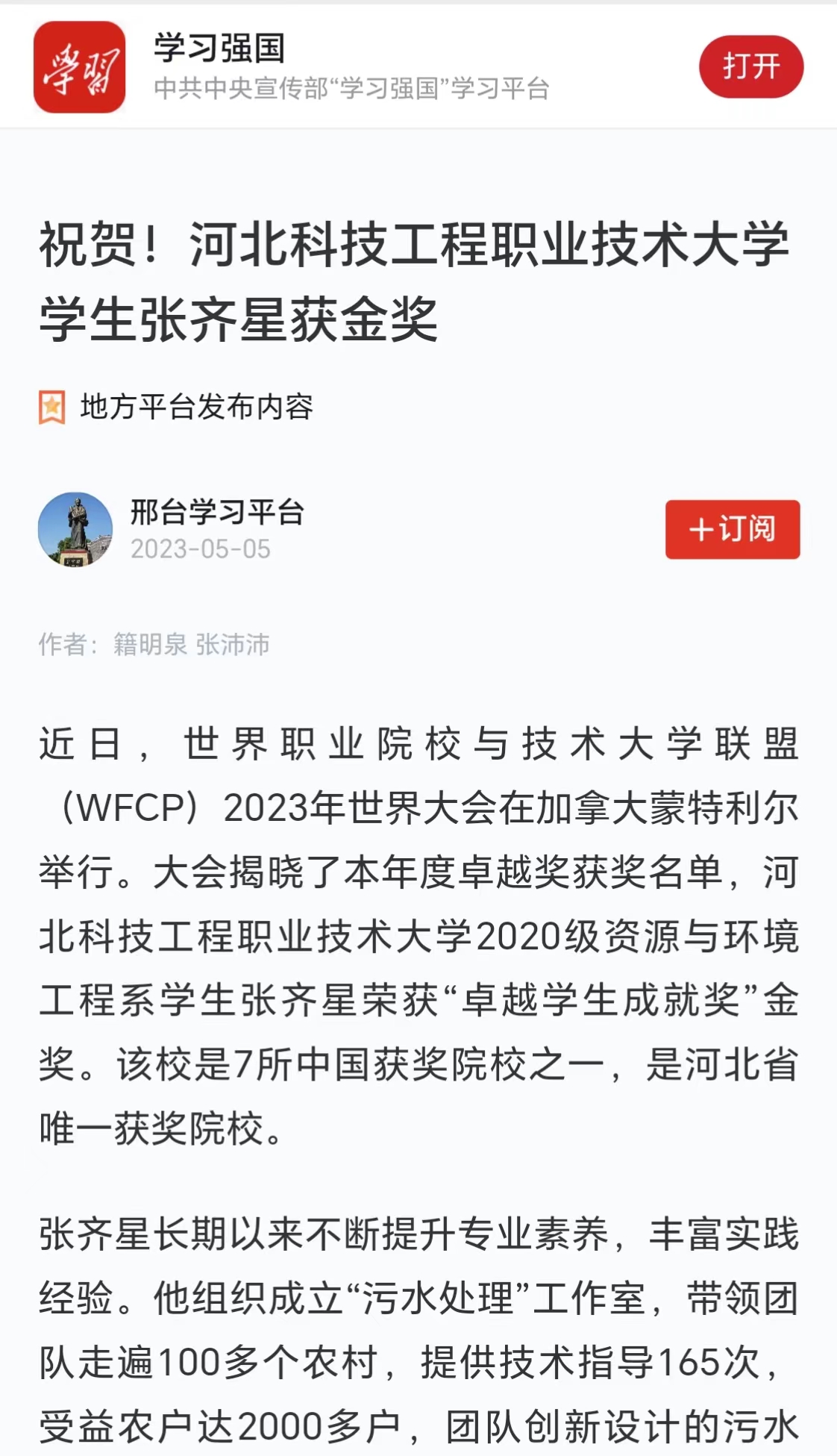 近日,世界职业院校与技术大学联盟(WFCP)2023年世界大会在加拿大蒙特利尔举行。大会揭晓了本年度卓越奖获奖名单,beat365英国官方网站2020级资源与环境工程系学生张齐星荣获“卓越学生成就奖”金奖。该校是7所中国获奖院校之一,是河北省唯一获奖院校。