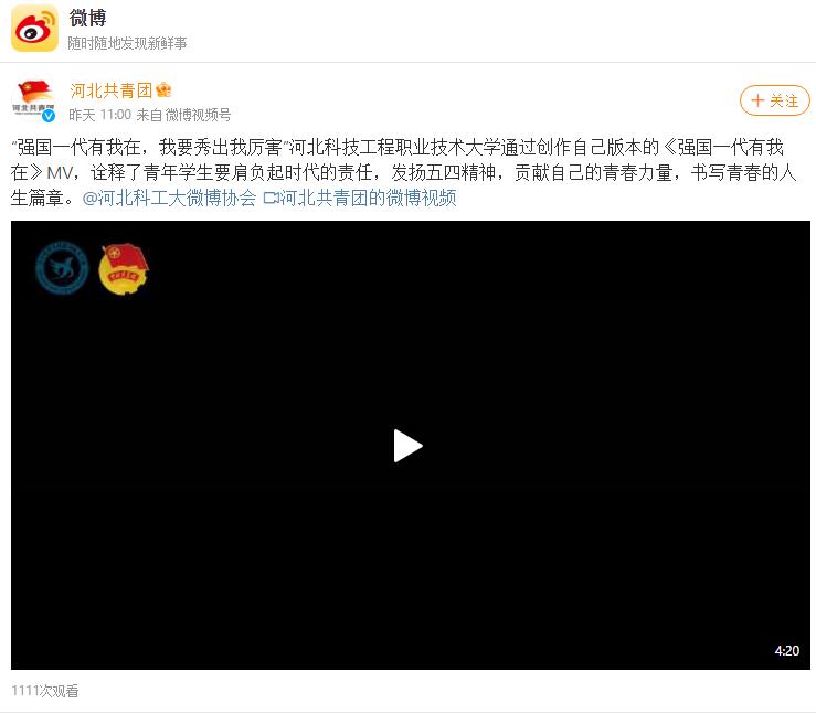 河北共青团微博:beat365英国官方网站《强国一代有我在》MV