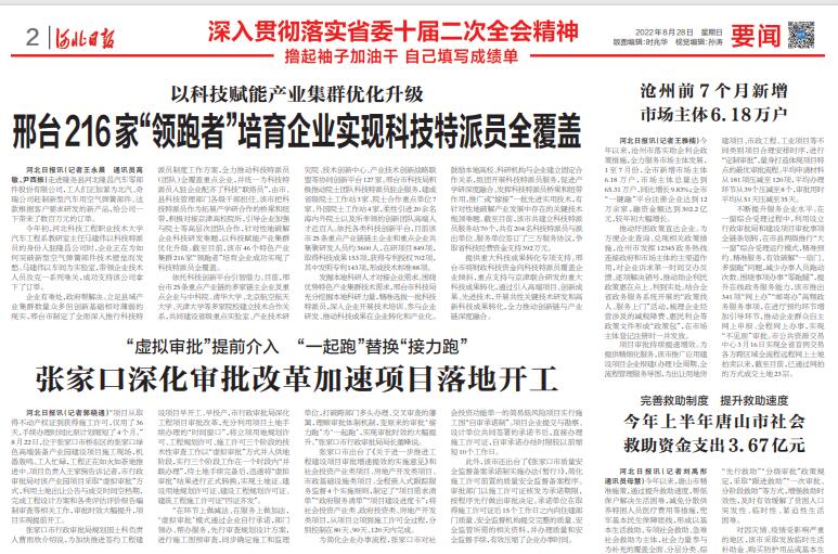 企业有难处,政府帮解决。立足县域产业集群数量众多但创新基础相对薄弱的现实,邢台市制定了全面深入推行科技特派员制度工作方案,全力推动科技特派员(团队)全覆盖重点企业,并统一为科技特派员入驻企业配齐了科技“联络员”,由市、县科技管理部门各级干部担任。该市把科技特派员作为拓展产学研合作的桥梁和纽带,积极对接京津高校院所,引导企业加强与院士等高层次团队合作,针对性地破解企业科技研发难题,以科技赋能产业集群优化升级。截至目前,该市46个特色产业集群216家“领跑者”培育企业成功实现了科技特派员全覆盖。