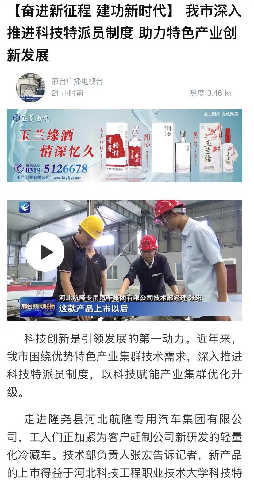 走进隆尧县河北航隆专用汽车集团有限公司,工人们正加紧为客户赶制公司新研发的轻量化冷藏车。技术部负责人张宏告诉记者,新产品的上市得益于beat365英国官方网站科技特派员的帮助和指导。