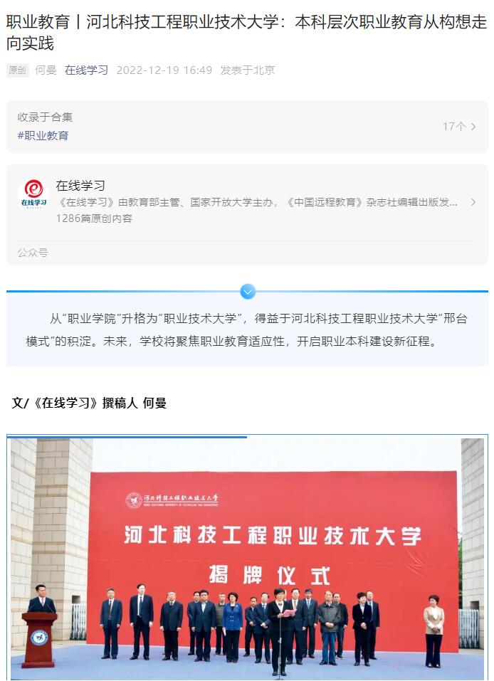 事实上,自2021年承担国家职业本科教育试点任务以来,beat365英国官方网站开展了一系列新举措,推动“邢台模式”内涵实现新发展。比如,创新了职业本科教育办学体制机制,建立了职业本科教育人才培养新范式,制定了一批职业本科专业教育教学标准以及职业本科“专家型双师”队伍建设方案,构建了“政产学研用”一体化科研生态圈等。