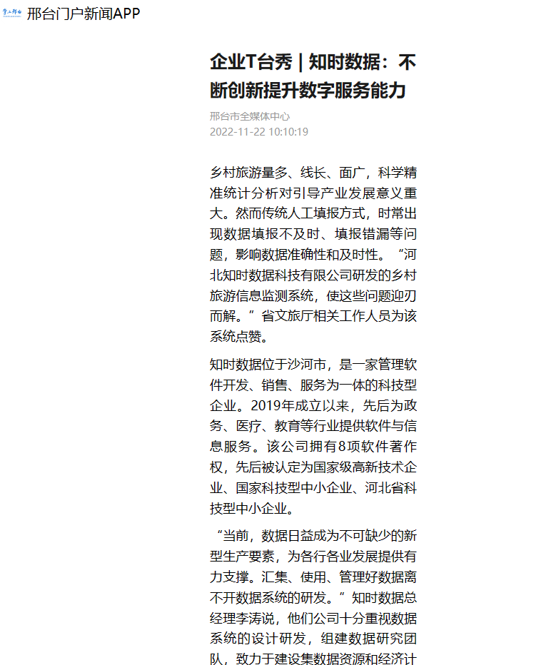 知时数据位于沙河市,是一家管理软件开发、销售、服务为一体的科技型企业。2019年成立以来,先后为政务、医疗、教育等行业提供软件与信息服务。该公司拥有8项软件著作权,先后被认定为国家级高新技术企业、国家科技型中小企业、河北省科技型中小企业。