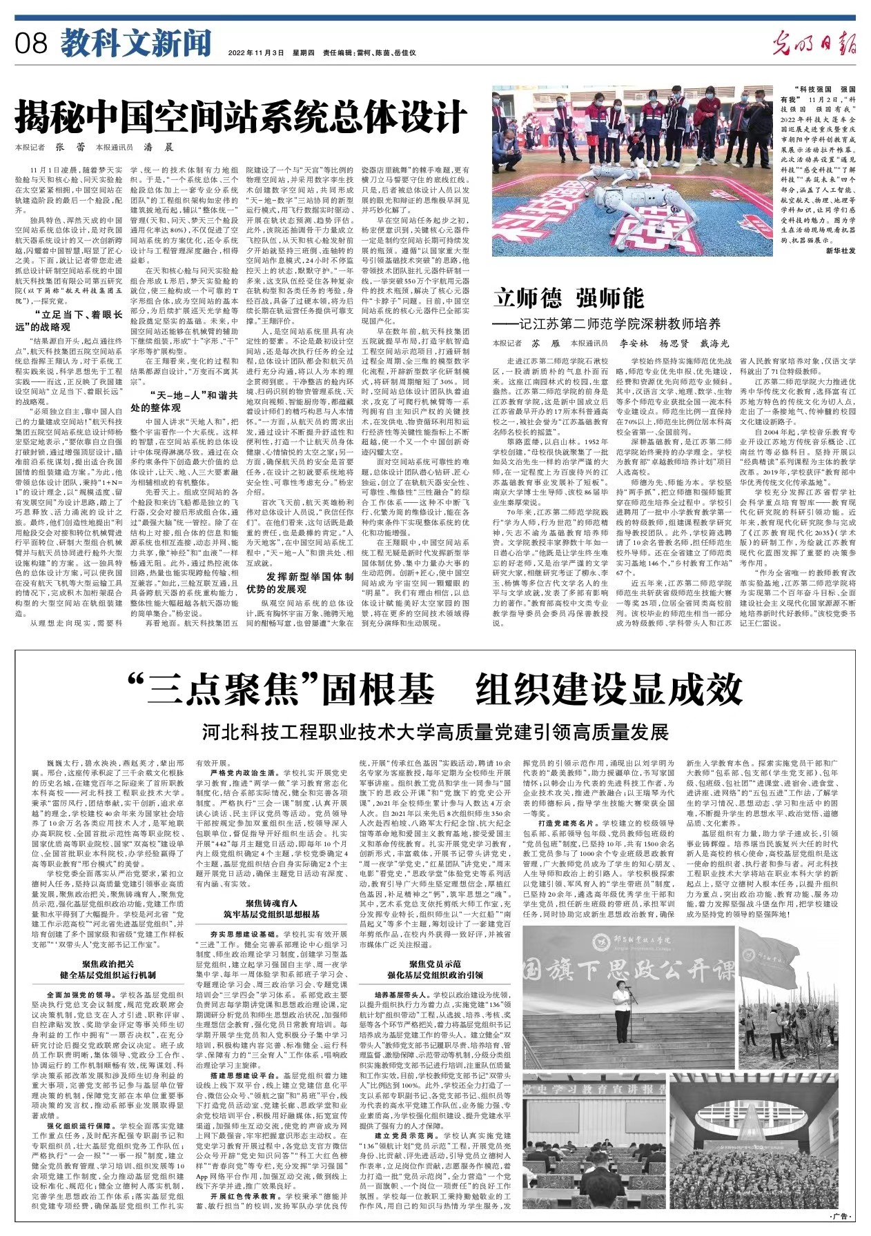 学校党委落实全面从严治党要求,紧扣立德树人任务,坚持以高质量党建引领事业高质量发展,聚焦政治把关,聚焦铸魂育人,聚焦党员示范,强化基层党组织政治功能,党建工作质量和水平得到了大幅提升。学校是河北省 “党建工作示范高校”“河北省先进基层党组织”,并培育创建了多个国家级和省级“党建工作样板支部”“‘双带头人’党支部书记工作室”。