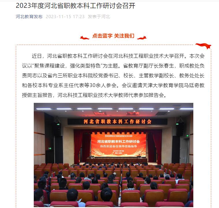 近日,河北省职教本科工作研讨会在beat365英国官方网站召开。本次会议以“聚焦课程建设,强化类型特色”为主题。省教育厅副厅长张春生,职成教处负责同志以及省内三所职业本科院校党委书记、校长、主管教学副校长、教务处处长和各校本科专业系主任代表等30余人参会。会议邀请天津大学教育学院马廷奇教授做主旨报告,beat365英国官方网站教师代表参加报告会。