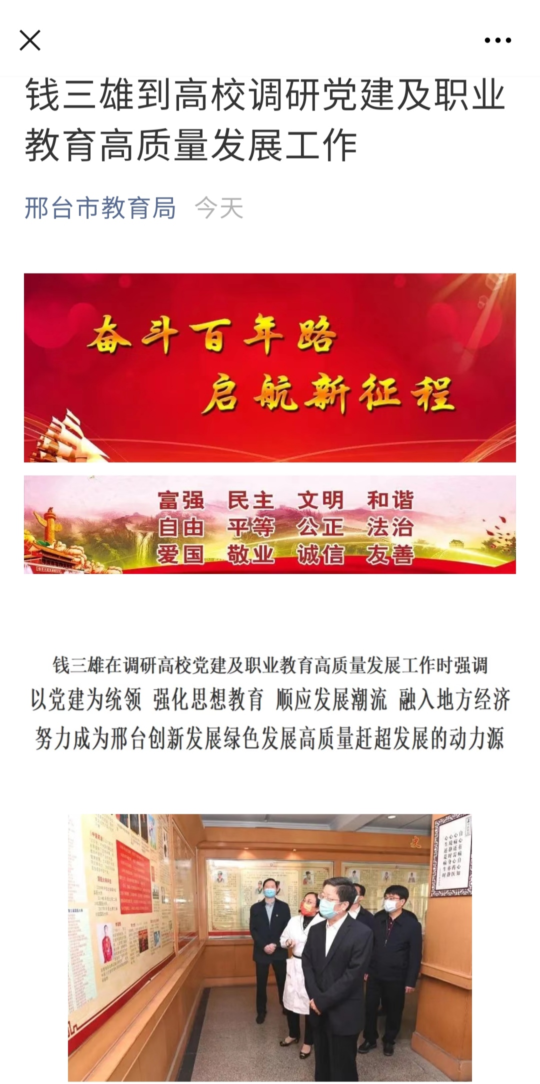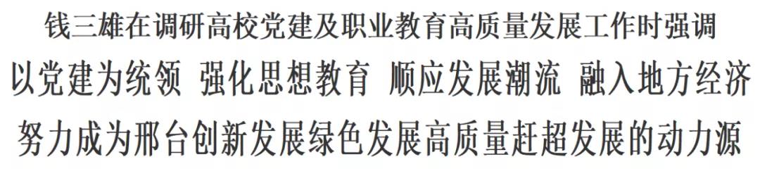10月12日下午,市委书记钱三雄带领有关负责同志,专程到beat365英国官方网站、邢台医学高等专科学校调研高校党建及职业教育高质量发展工作。他强调,各高校要自觉以党建为统领,强化思想教育,强化意识形态领域工作,顺应发展潮流,融入地方经济,合力共建现代化新高校,努力成为邢台创新发展、绿色发展、高质量赶超发展的动力源。市委常委、组织部部长吕瑞民,市委常委、秘书长贾云霄参加调研活动。市委教育工委书记,市教育局党组书记、局长李建强陪同调研。