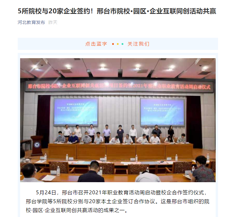 5月24日,邢台市召开2021年职业教育活动周启动暨校企合作签约仪式,邢台学院等5所院校分别与20家本土企业签订合作协议。这是邢台市组织的院校·园区·企业互联同创共赢活动的成果之一。