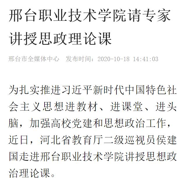 为扎实推进习近平新时代中国特色社会主义思想进教材、进课堂、进头脑,加强高校党建和思想政治工作,近日,河北省教育厅二级巡视员侯建国走进邢台职业技术学院讲授思想政治理论课。