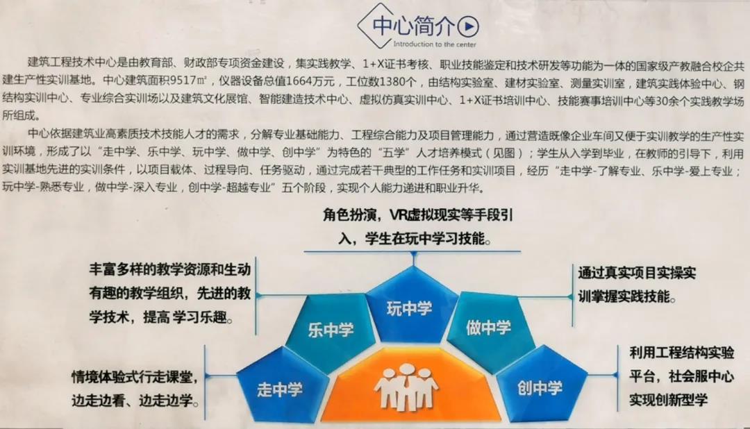 建筑工程技术中心是国家级产教融合校企共建生产性实训基地,这里还探索出职业教育“五学”人才培养模式