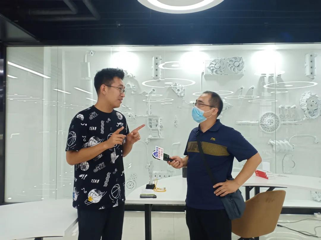 电气系老师李鑫(左)介绍守敬创新工作室情况