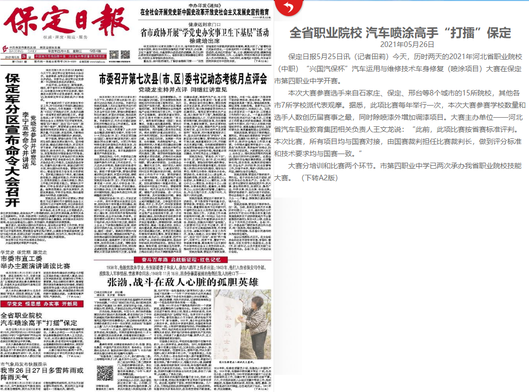 保定日报5月25日讯(记者田莉)今天,历时两天的2021年河北省职业院校(中职)“兴国汽保杯”汽车运用与维修技术车身修复(喷涂项目)大赛在保定市第四职业中学开赛。