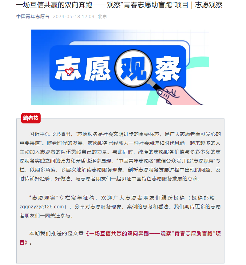 三是生动实践了残健共融的理念风尚。在“青春志愿助盲跑”活动中,青年志愿者和盲友是双向奔赴、互相支持、互信共赢的。一方面,盲友在青年志愿者的陪伴和引导下,走向户外强健体魄、融入社会。另一方面,青年志愿者在其中能够亲身体验到盲友在日常生活中面临的困难和挑战,深化同理心与对视障人士的尊重,锻炼耐心和包容心,培养团队协作精神,塑造阳光心态。“以前我的孩子不爱说话,自从参加了助盲跑活动后,回家后他主动找我聊起与志愿者的交谈内容,感觉自己的孩子开朗了、有自信了,作为家长我非常感谢他们。”视障儿童的家长说。参与助盲跑活动的大学生志愿者唐姿婷表示,“从我参加的第一天开始,那些盲友的乐观与活泼便感染了我,我好像进入了一个全新的世界。那些孩子的童真是真切存在的,他们在疲惫时的坚持、在训练时的努力,我都看在眼里。他们如此努力,我们更应该尽我们的所能去帮助他们。我们应该像是他们的眼睛,带他们领略这缤纷多彩的世界”。志愿者以残为师、向上成长,盲友得到锻炼、交到朋友,双方因兴趣结缘、互相尊重、共同成长、融合发展,这大抵是“青春志愿助盲跑”项目最特有的魅力。
