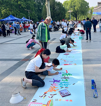 5月9日,在全国共青团为老志愿服务和助残志愿服务现场会上,孩子和家长认真为百米画卷涂色。