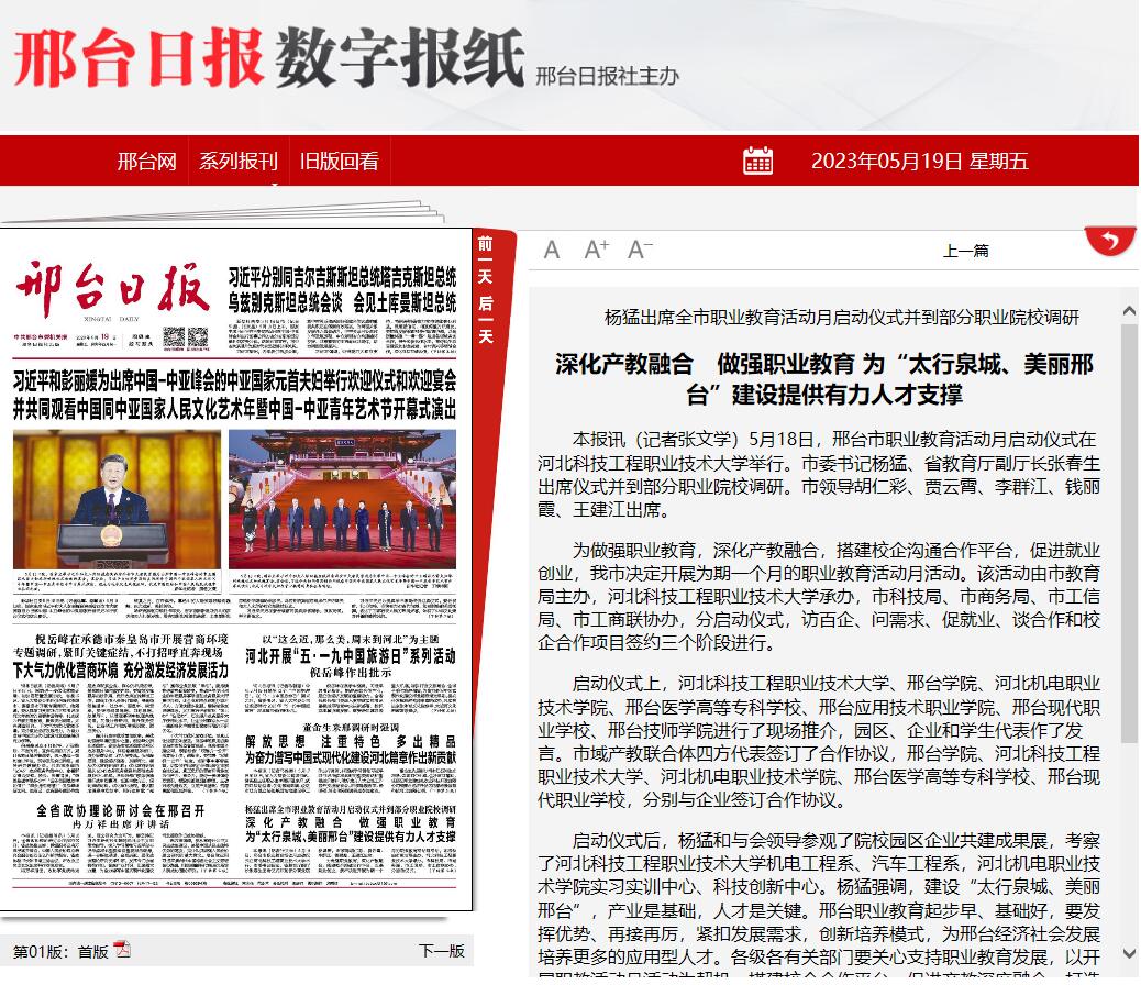本报讯(记者张文学)5月18日,邢台市职业教育活动月启动仪式在beat365英国官方网站举行。市委书记杨猛、省教育厅副厅长张春生出席仪式并到部分职业院校调研。市领导胡仁彩、贾云霄、李群江、钱丽霞、王建江出席。