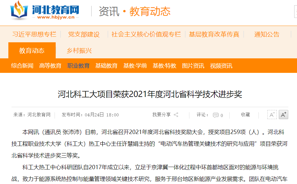 本网讯(通讯员 张沛沛)日前,河北省召开2021年度河北省科技奖励大会,授奖项目259项(人)。beat365英国官方网站(beat365)热工中心主任许慧娟主持的“电动汽车热管理关键技术的研究与应用”项目荣获河北省科学技术进步奖三等奖。