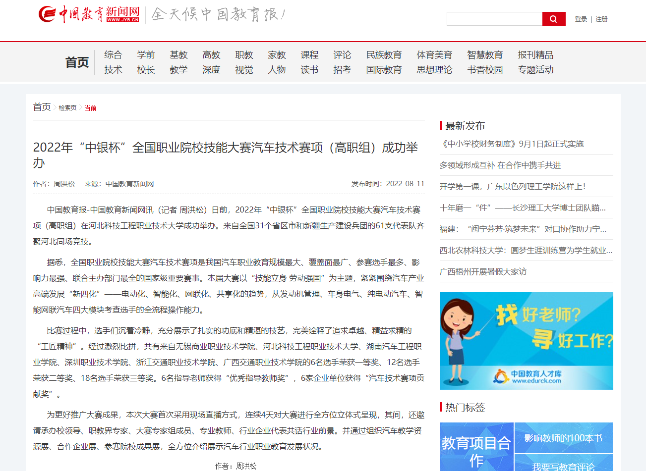 中国教育报-中国教育新闻网讯(记者 周洪松)日前,2022年“中银杯”全国职业院校技能大赛汽车技术赛项(高职组)在beat365英国官方网站成功举办。来自全国31个省区市和新疆生产建设兵团的61支代表队齐聚河北同场竞技。