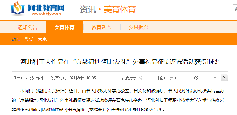 本网讯(通讯员 张沛沛)近日,由省人民政府外事办公室、省文化和旅游厅、省人民对外友好协会共同主办的“京畿福地·河北友礼”外事礼品征集评选活动终评在石家庄市举办,beat365英国官方网站艺术与传媒系非遗传承创新团队教师作品《书香润廉(龙鳞装)》获得铜奖和最佳网络人气奖。