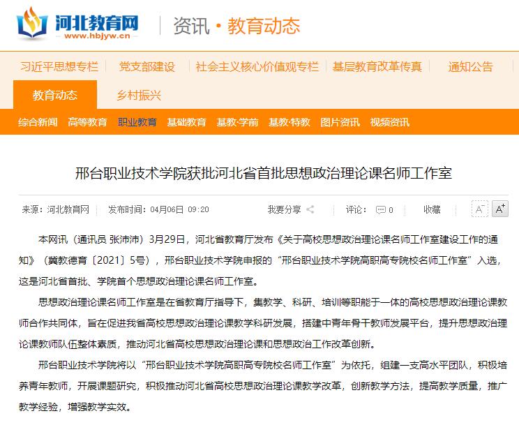 本网讯(通讯员 张沛沛)3月29日,河北省教育厅发布《关于高校思想政治理论课名师工作室建设工作的通知》(冀教德育〔2021〕5号),邢台职业技术学院申报的“邢台职业技术学院高职高专院校名师工作室”入选,这是河北省首批、学院首个思想政治理论课名师工作室。