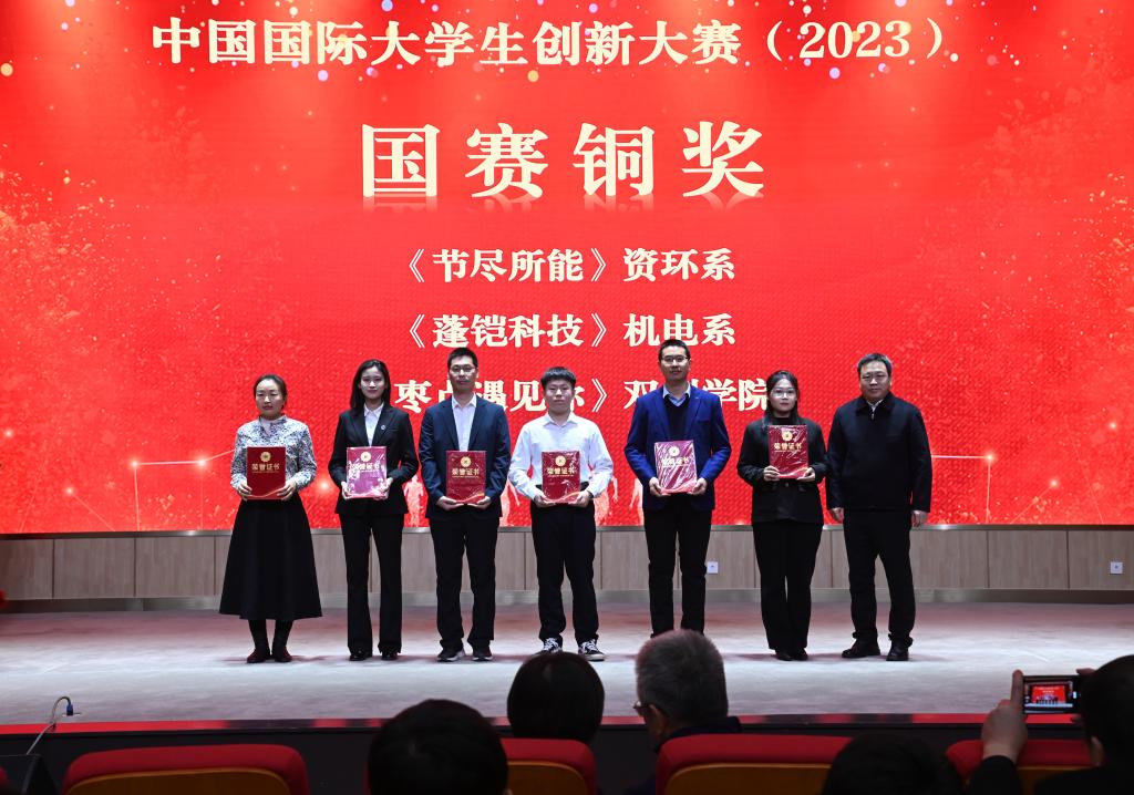 在优秀项目表彰环节,学校对4个国赛获奖项目及34个省赛获奖项目进行表彰并颁发荣誉证书。2023年,学校荣获中国国际大学生创新大赛(2023)金奖1项,实现国赛金奖0的突破,同时荣获国赛铜奖3项,省赛金奖5项,银奖17项,铜奖12项,实现省赛推荐项目100%获奖。